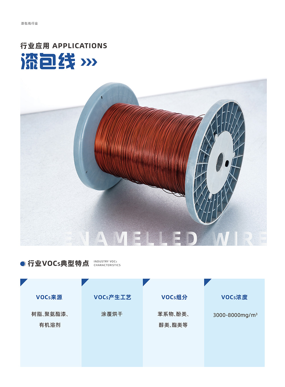 漆包线制造,从上世纪70年代至今,我国已经拥有了规模非常庞大的产业集群,先进的漆包线制造能力,在发展过程中,由于漆包线制造的精密度与品质要求在不断提高,所以涂料技术在不断革新,与此同时,会大量使用挥发性溶剂,在此生产过程中会产生大量的VOCs废气,且种类繁多,VOCs废气治理面临着艰巨的挑战,无组织排放已经不符合环保要求,业主方势必要在环保治理方面加大投入,从而达到降低VOCs的排放及节约能源的目的。